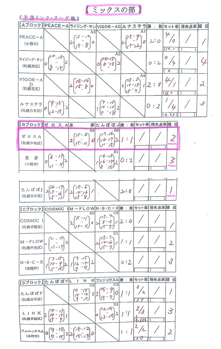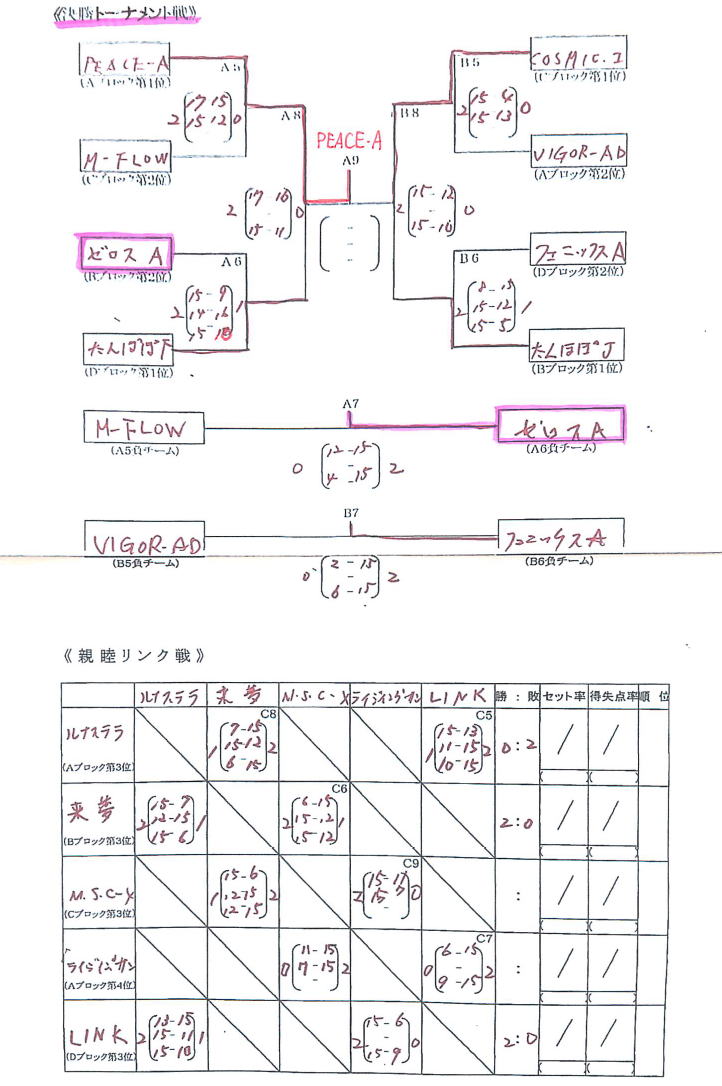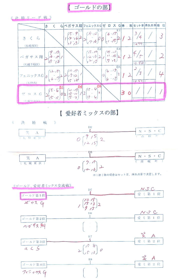 ゼロス以外の3チームが1勝1敗と接戦の大会の中、第一試合で前年度優勝のさくら(ケンちゃん、内藤パパ)と対戦し、常に集中と声を出しあってのプレーで相手に隙を与えずストレートで勝利する。その後の試合もペガサス戦でフルセットとなるが最終セットは一致団結した試合展開で勝利し3戦全勝で優勝する。