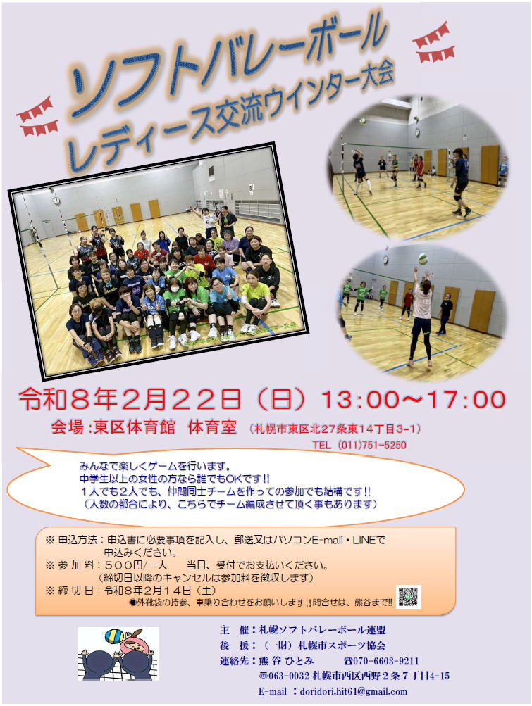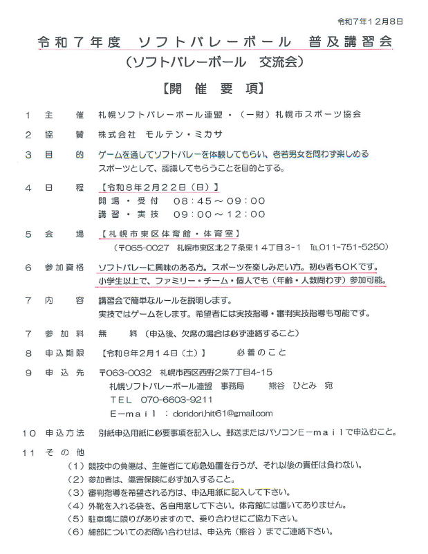 ☆普及講習会&レディース交流大会 R8.1.24現在 不参加⇒参加者が小学生・ファミリーや午後からのレディース大会参加メンバーのため 【開催要項】 <参考>昨年度写真⇒むっちゃんもお手伝い参加 【レディース交流大会チラシ】 試合TOP TOP